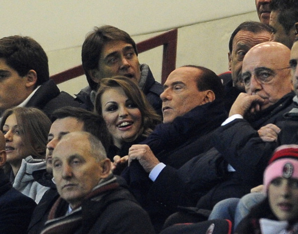 MILAN, ITALY – DECEMBER 04: Silvio Berlusconi and Francesca Pascale (L) attend the UEFA Champions League group C match between AC Milan and Zenit St Petersburg at San Siro Stadium on December 4, 2012 in Milan, Italy. (Photo by Claudio Villa/Getty Images)